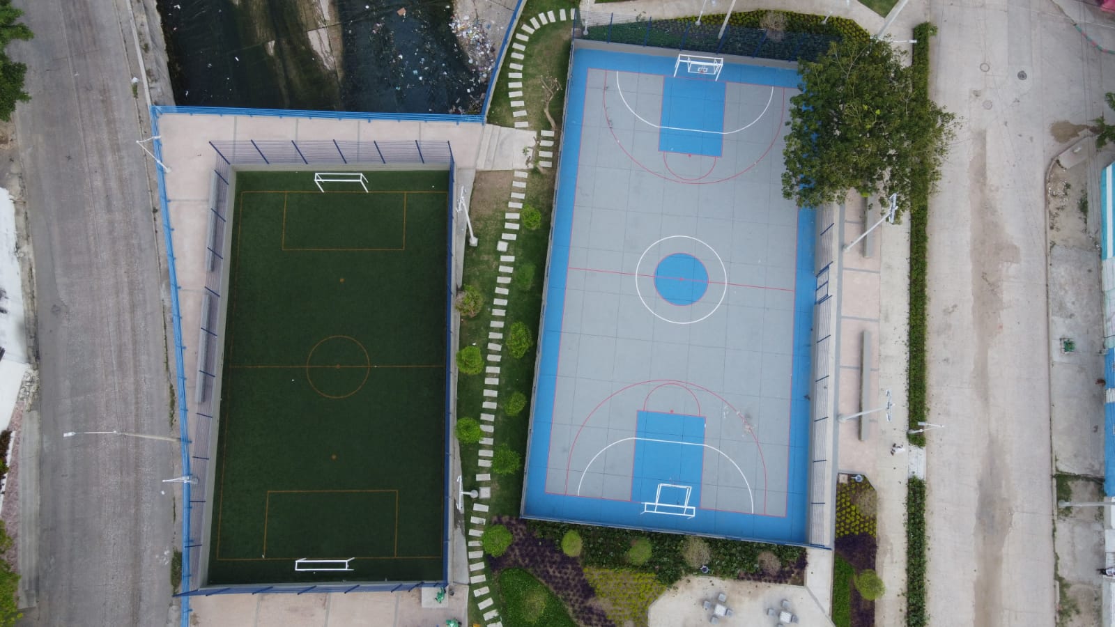 En la extensión de terreno se construyó la cancha de fútbol con grama sintética, una amplia plazoleta, zona de gimnasio biosaludable y áreas de descanso con mobiliario.