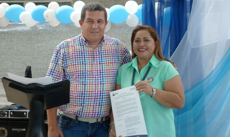 El secretario de Educación, José Carlos Herrera, entrega una exaltación a la rectora del IED Sarid Arteta de Vásquez.
