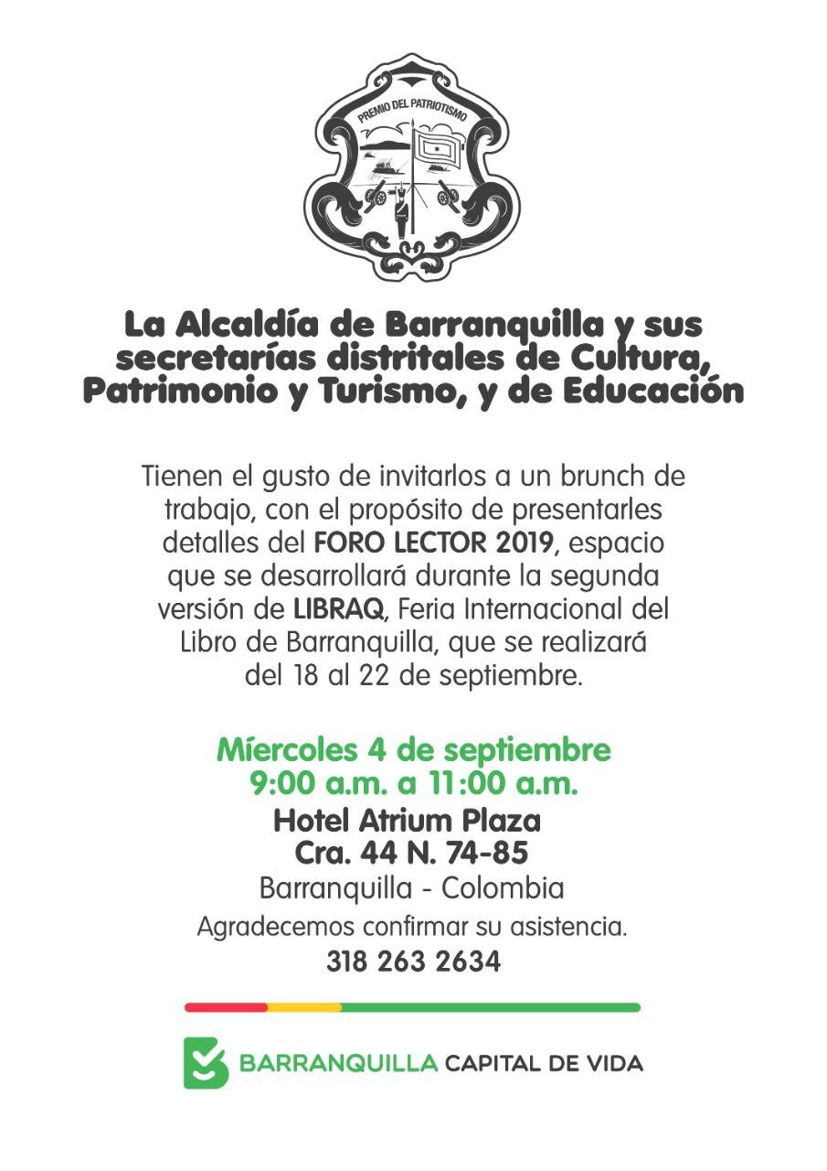 Invitación a un brunch de trabajo, con el propósito de presentarles detalles del FORO LECTOR 2019, espacio que se desarrollará durante la segunda versión de LIBRAQ, Feria Internacional del Libro de Barranquilla, que se realizará del 18 al 22 de septiembre.