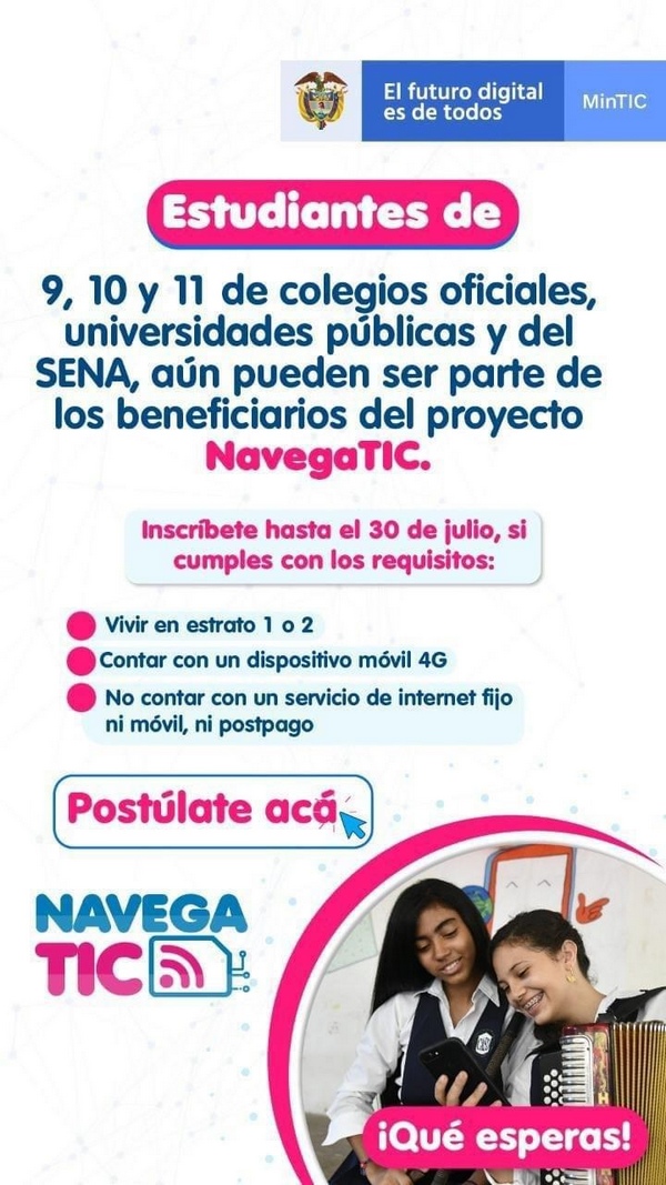 Participa de la convocatoria para ser uno de los beneficiarios del proyecto NavegaTIC y disfruta de las ventajas de la conectividad. ¡El Ministerio TIC llevará servicios de voz y datos móviles a estudiantes de instituciones oficiales!. Si quieres hacer parte de la base de datos de potenciales beneficiarios del proyecto, te invitamos a diligenciar el formulario en línea. VIGENCIA CONVOCATORIA HASTA EL 31 DE JULIO DE 2022.
